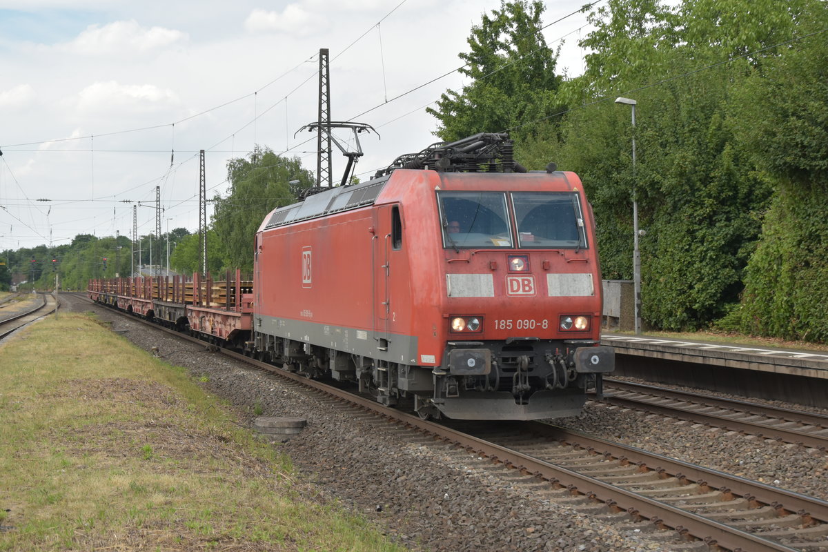 120m Schienen auf Rungenwagen bringt die 185 090-8 durch Bonn-Mehlem gen Koblenz am Samstag den 8.7.2017