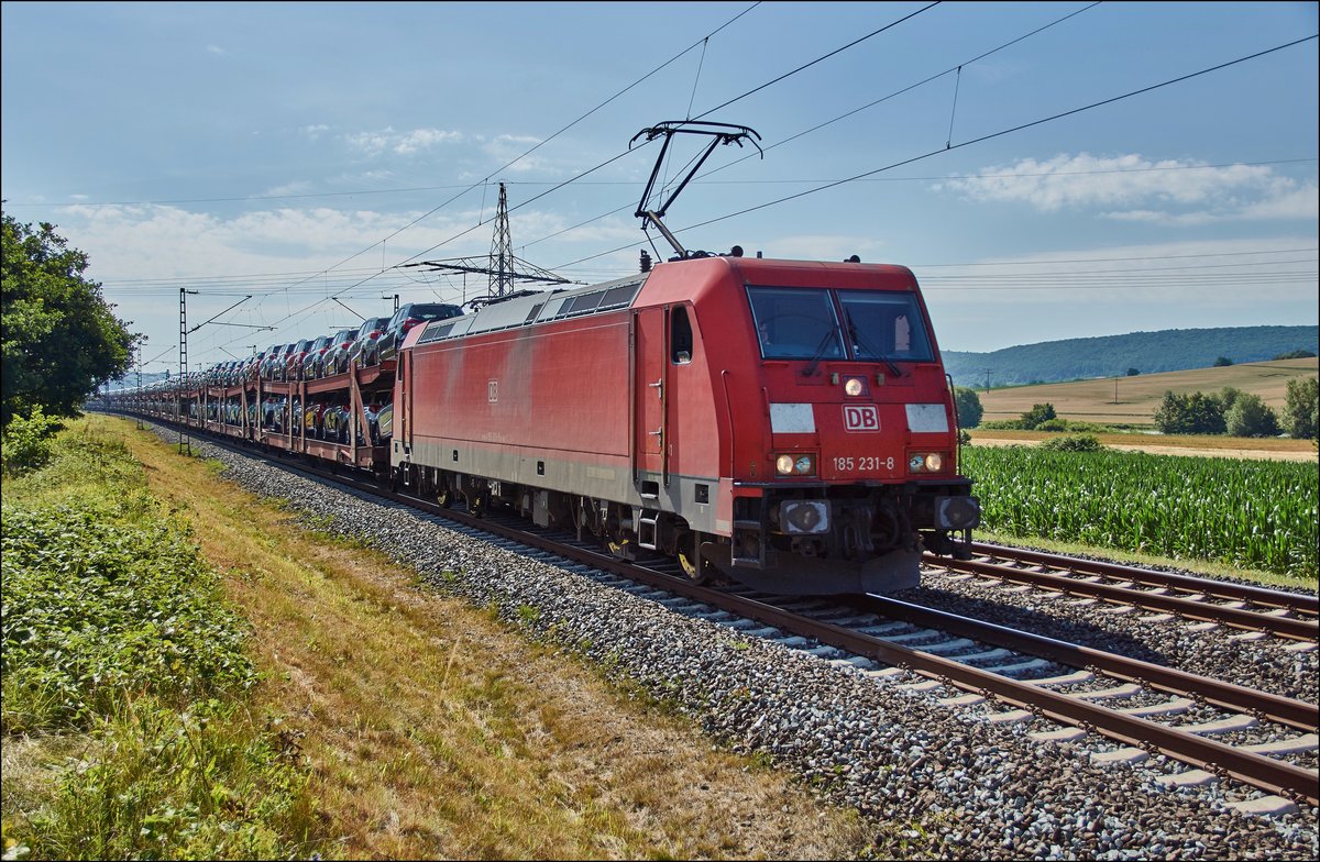 185 231-8 ist mit einen Autozug bei Harrbach am 05.07.2017 zu sehen.