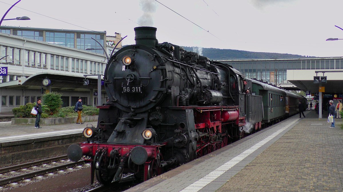 Die 58 311 war am 09.10.2016 mit einem Sonderzug im zwischen Heidelberg und Bruchsal unterwegs. Hier ist der Dampfsonderzug kurz vor der Abfahrt in Heidelberg Hbf zu sehen.