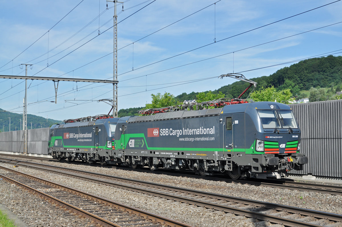 Doppeltraktion, mit den Loks 193 259-9 und 193 258-1, durchfahren den Bahnhof Gelterkinden. Die Aufnahme stammt vom 05.07.2017.