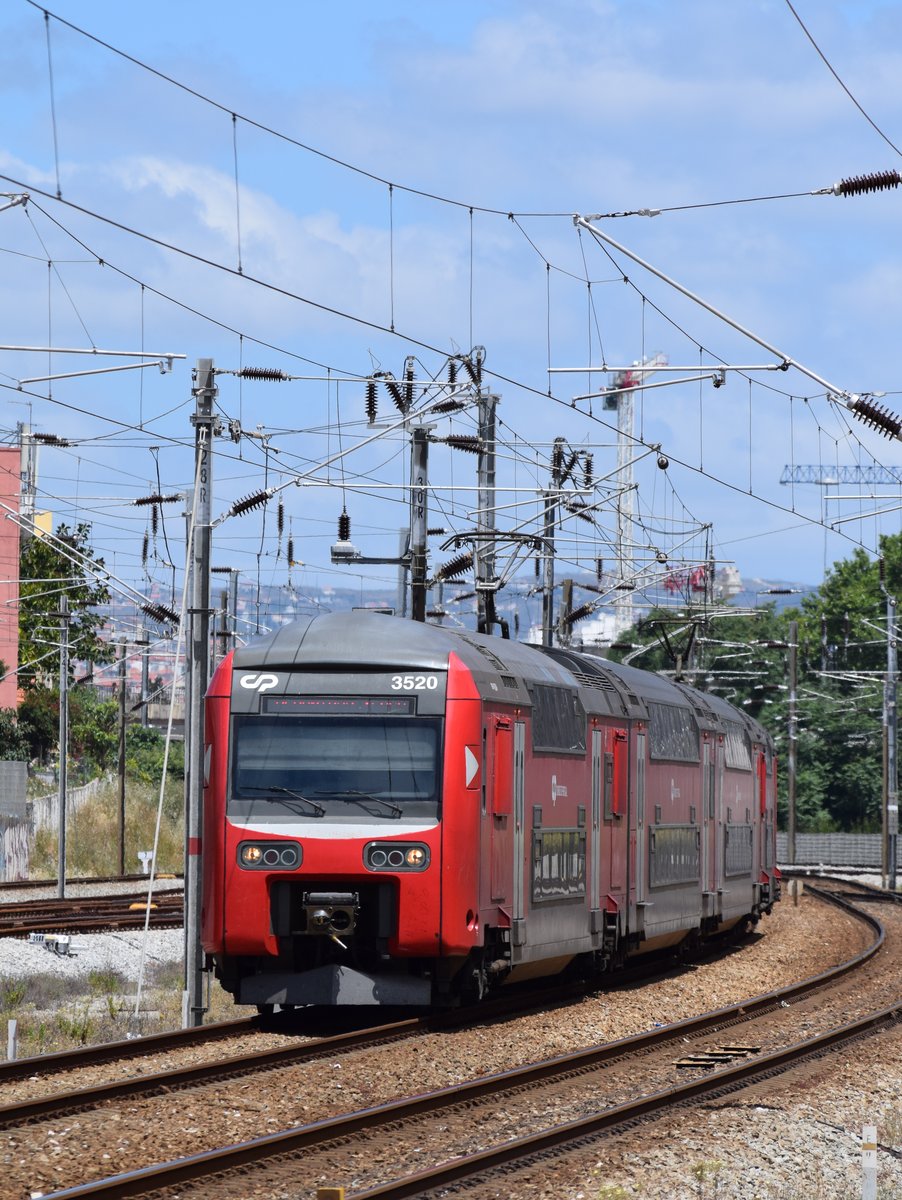 Ein Triebzug der Baureihe 3500 nähert sich am 06.06.2017 dem Bahnhof Lissabon Oriente.