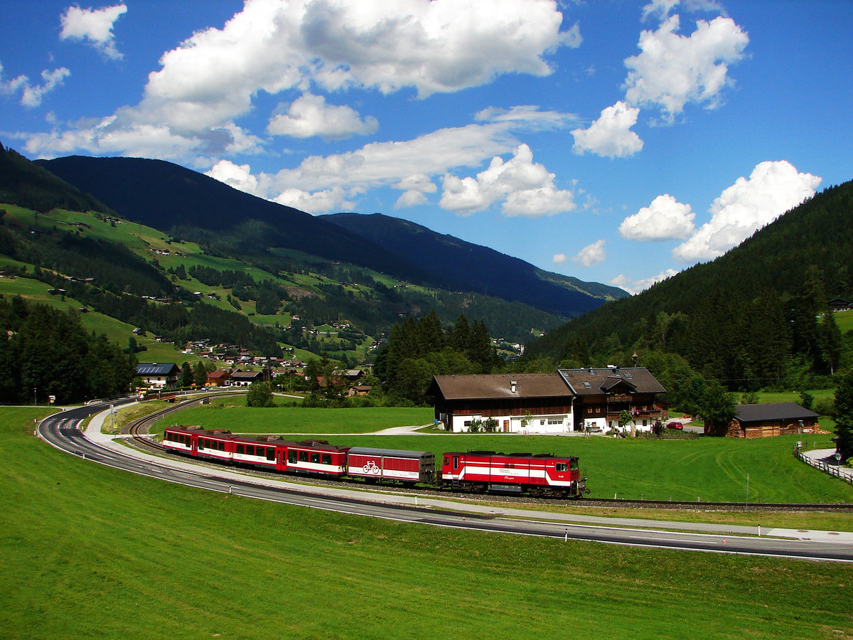 Zillertalbahn D16 Diesellok mit dem Planzug von Jenbach nach Mayrhofen kurz vor Zell am Ziller.