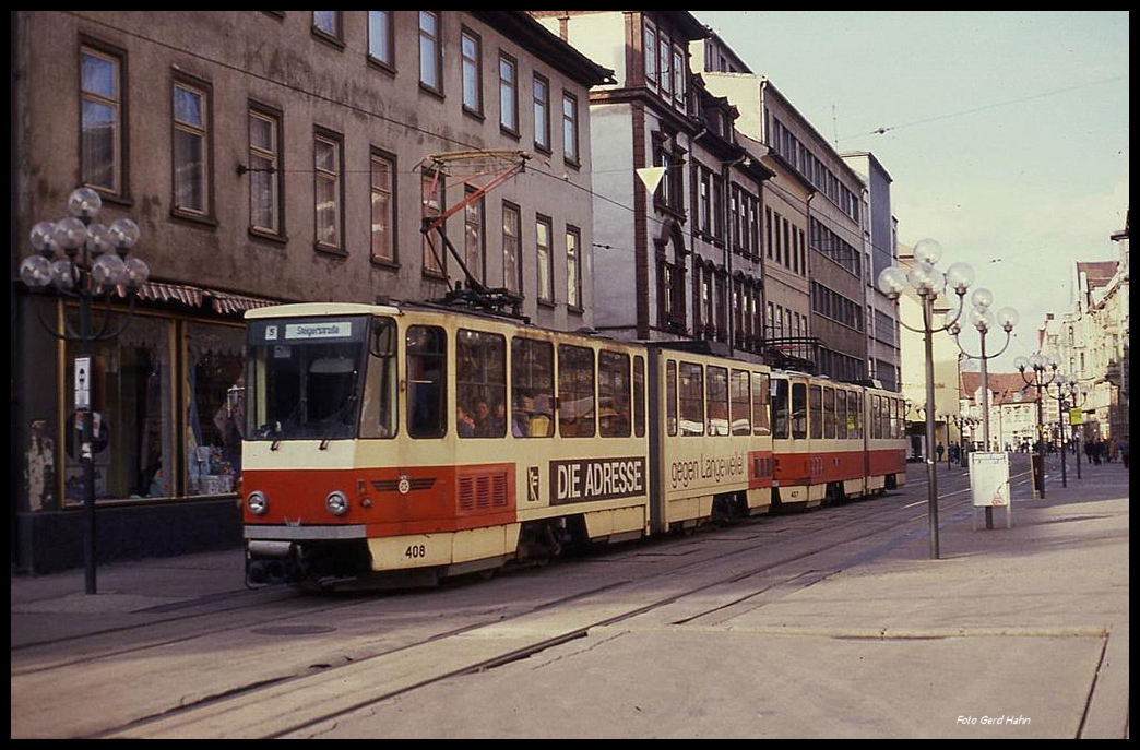 Tatra Tram Wagen 408 und ein weiteres unbekanntes Fahrzeug sind hier in der Innenstadt von Erfurt am 21.11.1990 auf der Linie 5 unterwegs.