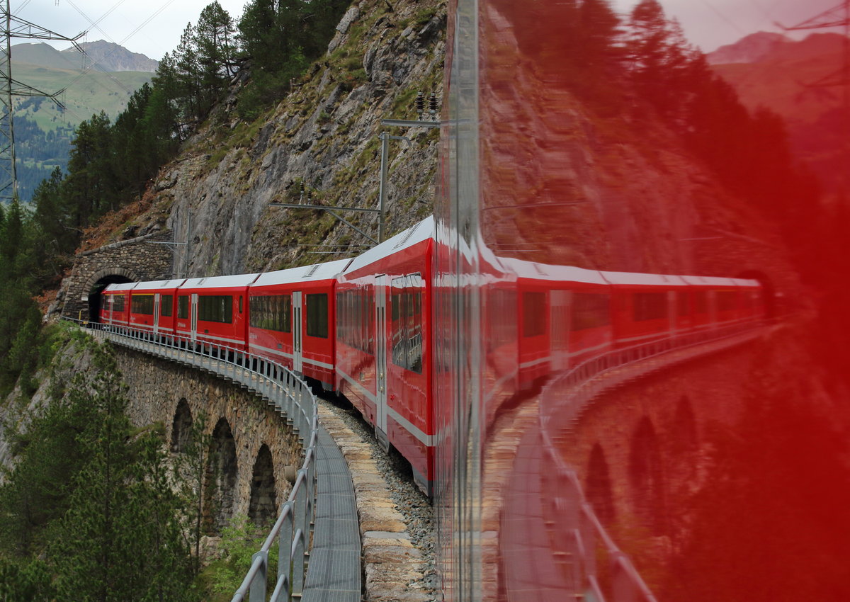 Unterwegs im Fotoabteil des "Alvra" Albula-Gliederzug, konnte ich es nicht lassen die Spiegelungen mit ins Bild zu nehmen. Hier befindete sich unser RE1152 kurz hinter dem Albula-Viadukt I und kurz vor Muot.