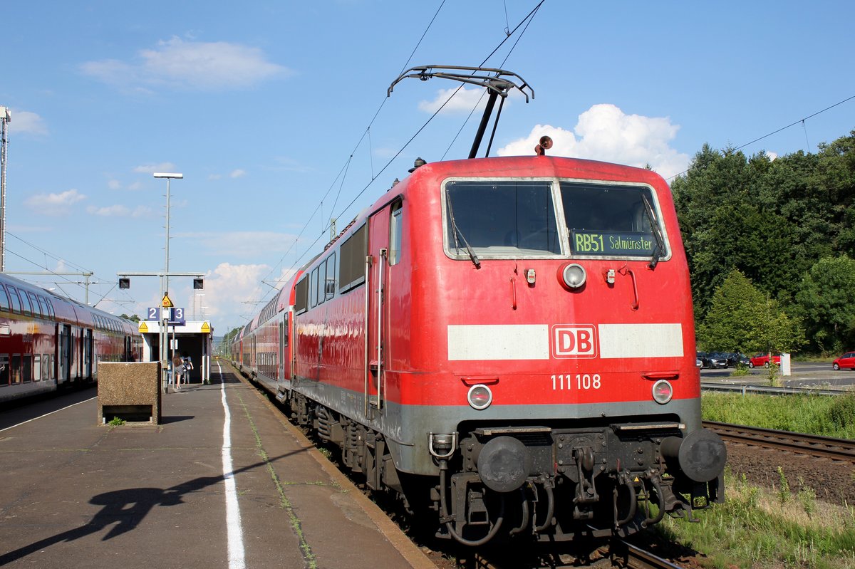 111 108 mit einer Verstärker-RB am Nachmittag steht planmäßig in Langenselbold auf Gleis 3 und wartet, bis der Gegenzug in den Bahnhof eingefahren ist. Die Kinzigtalbahn ist von Hanau-Wolfgang bis Hailer-Meerholz dreigleisig, wobei die Regionalbahnen nur das mittlere Streckengleis nutzen; die Fernzüge überholen jene auf den Außengleisen.