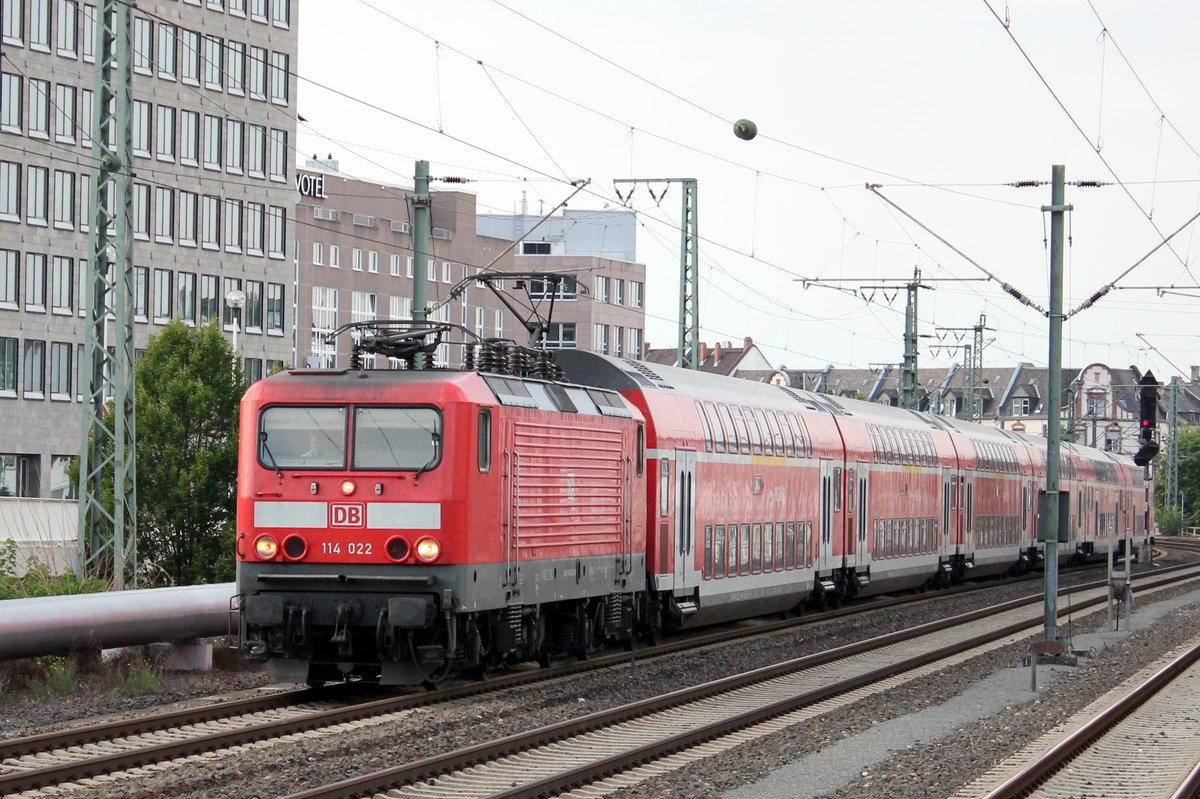 114 022 kommt mit ihren sechs Doppelstockwagen am Freitag Abend zurück nach Frankfurt, aufgenommen am Bahnhof Messe. Der Zug ist Zur Hauptverkehrszeit als Verstärkerzug von dort aus nach Gießen gefahren. Wenn die Leerfahrt dann zum zweiten Mal am Hauptbahnhof ist, geht es um 19:01 ein weiteres Mal nach Gießen.