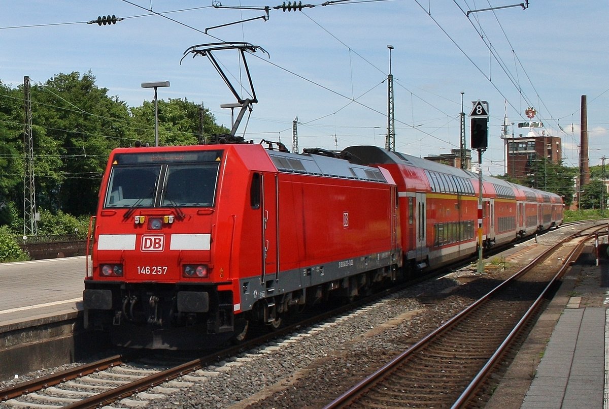 146 257 schiebt am 3.7.2017 den RE6 (RE10619) "Westfalen-Express" von Köln/Bonn Flughafen nach Minden(Westf) aus dem Bochumer Hauptbahnhof.