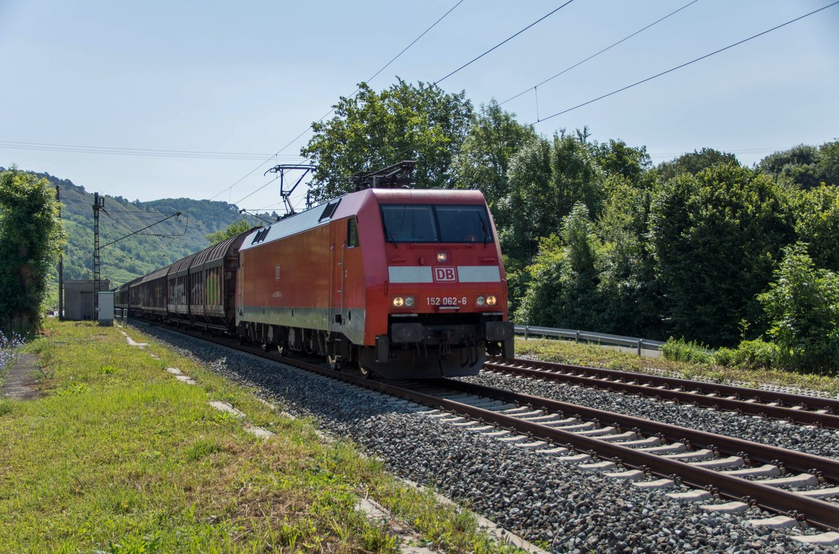 152 062-6 ist mit einen Schiebewandzug bei Gambach am 05.07.2017 zu sehen.