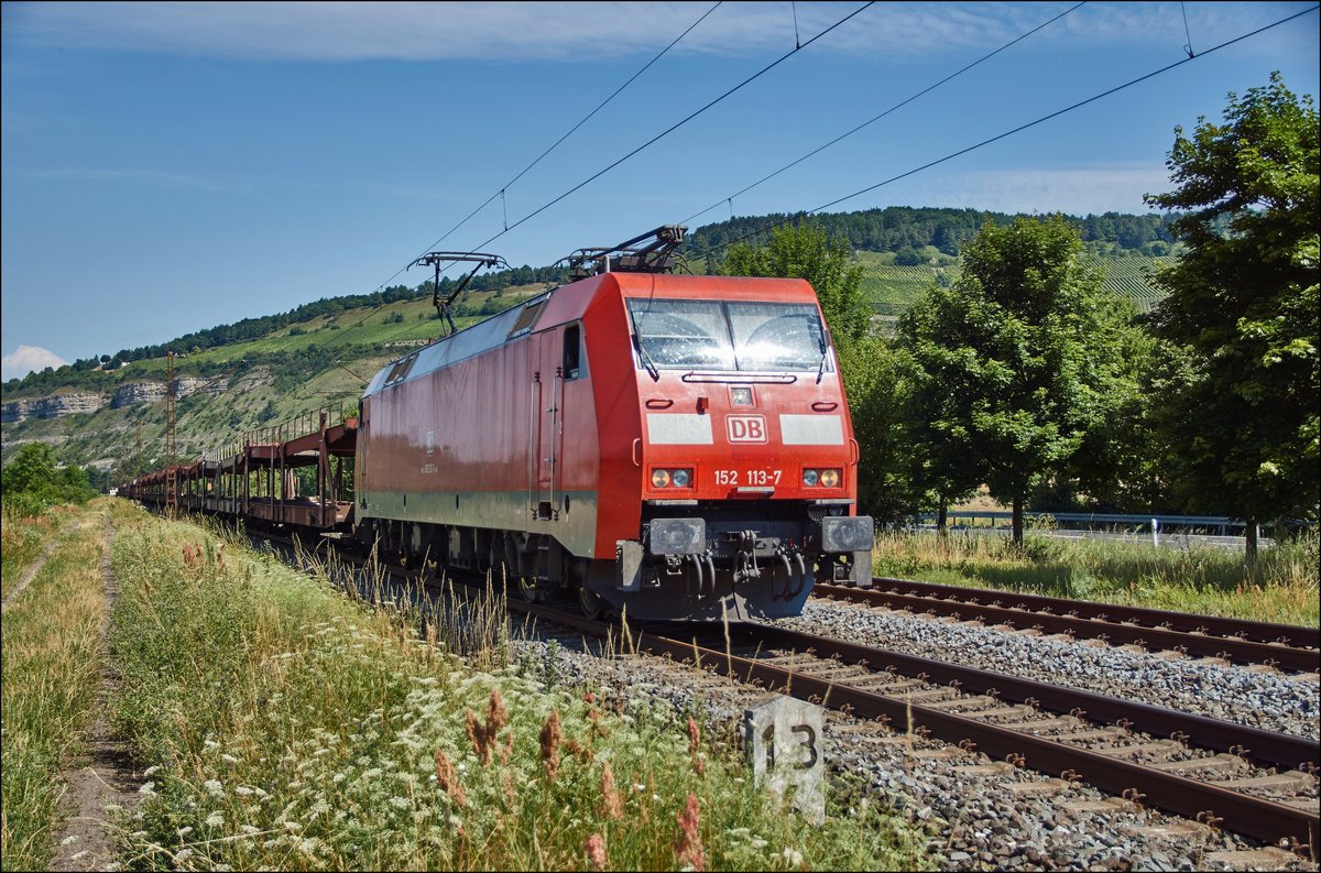 152 113-7 ist mit einen leeren Autozug bei Thüngersheim am 05.07.2017 unterwegs.