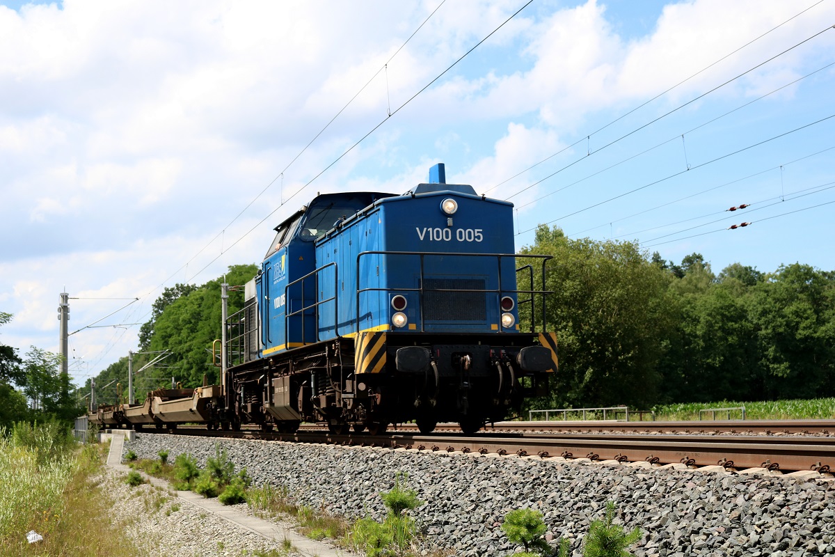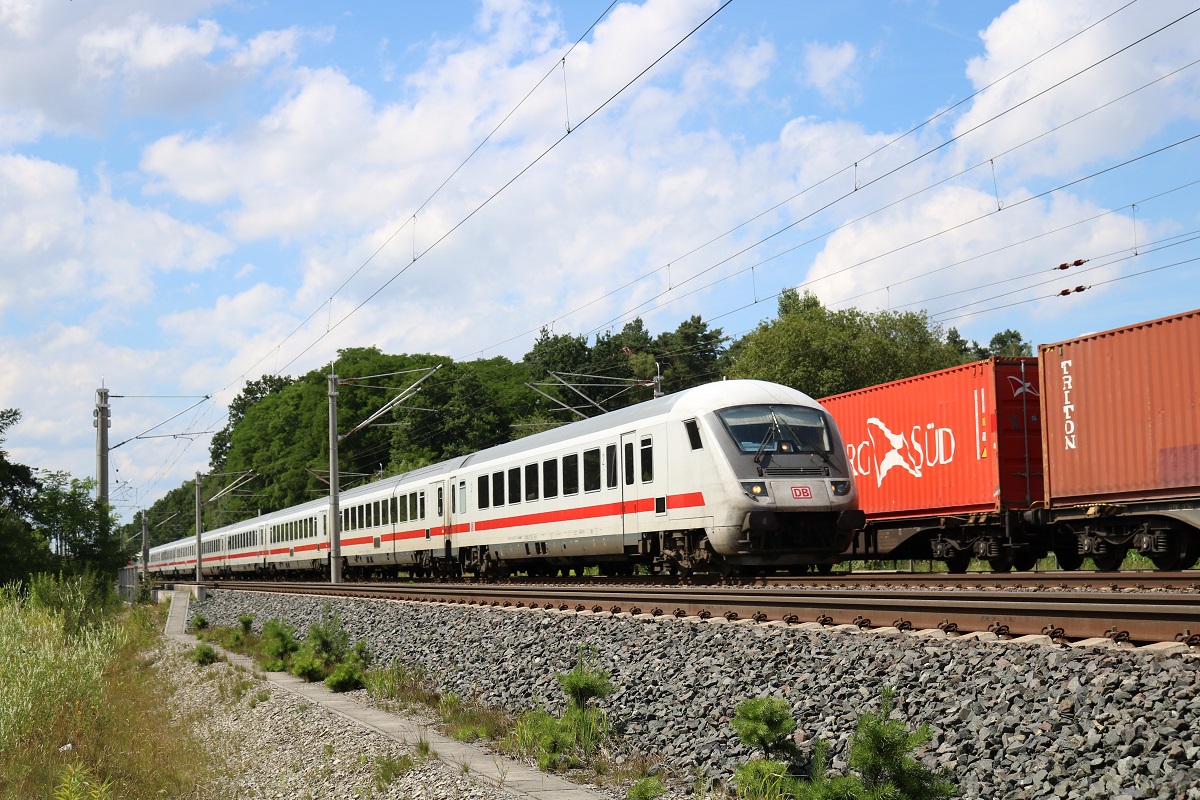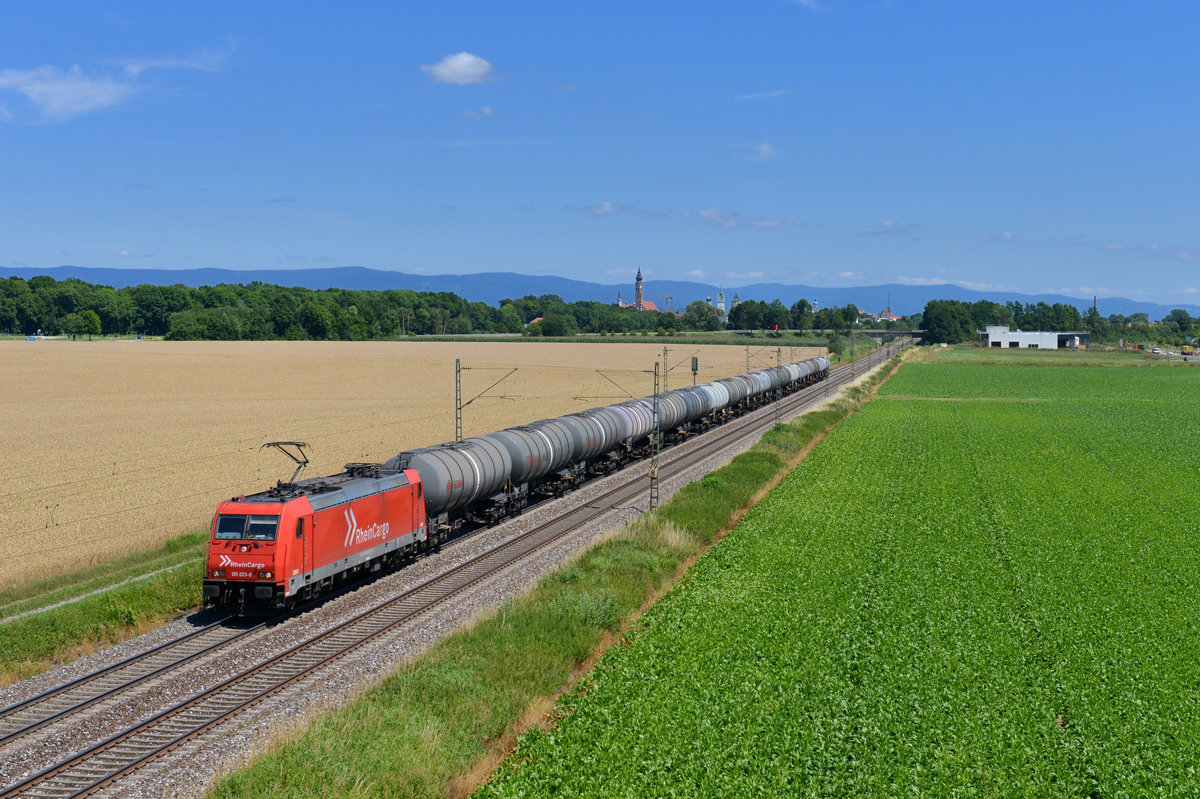 186 910 und eine weitere 186er fahren am 4. Juli 2017 mit einem UKV-Zug bei Einigen in Richtung Norden.