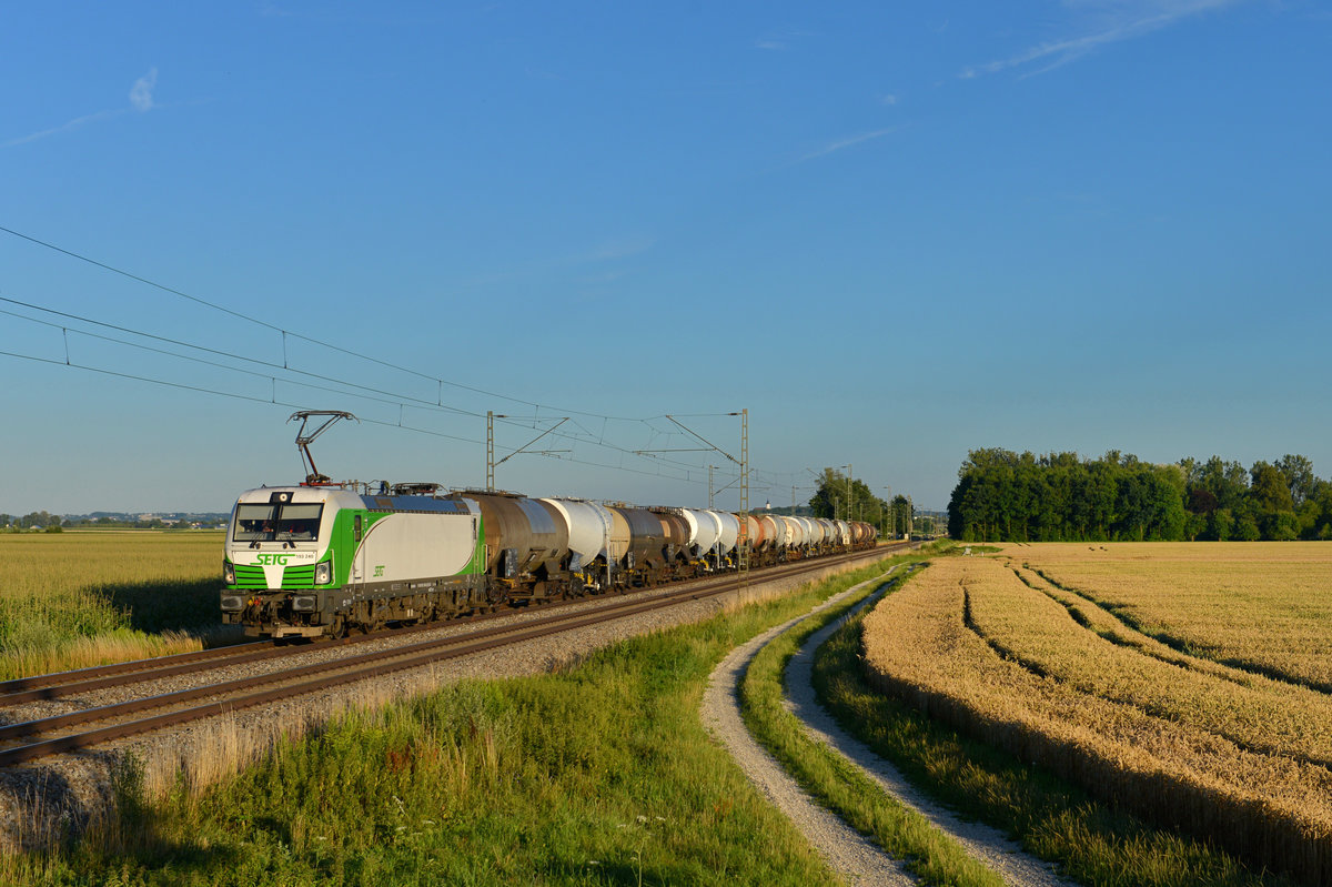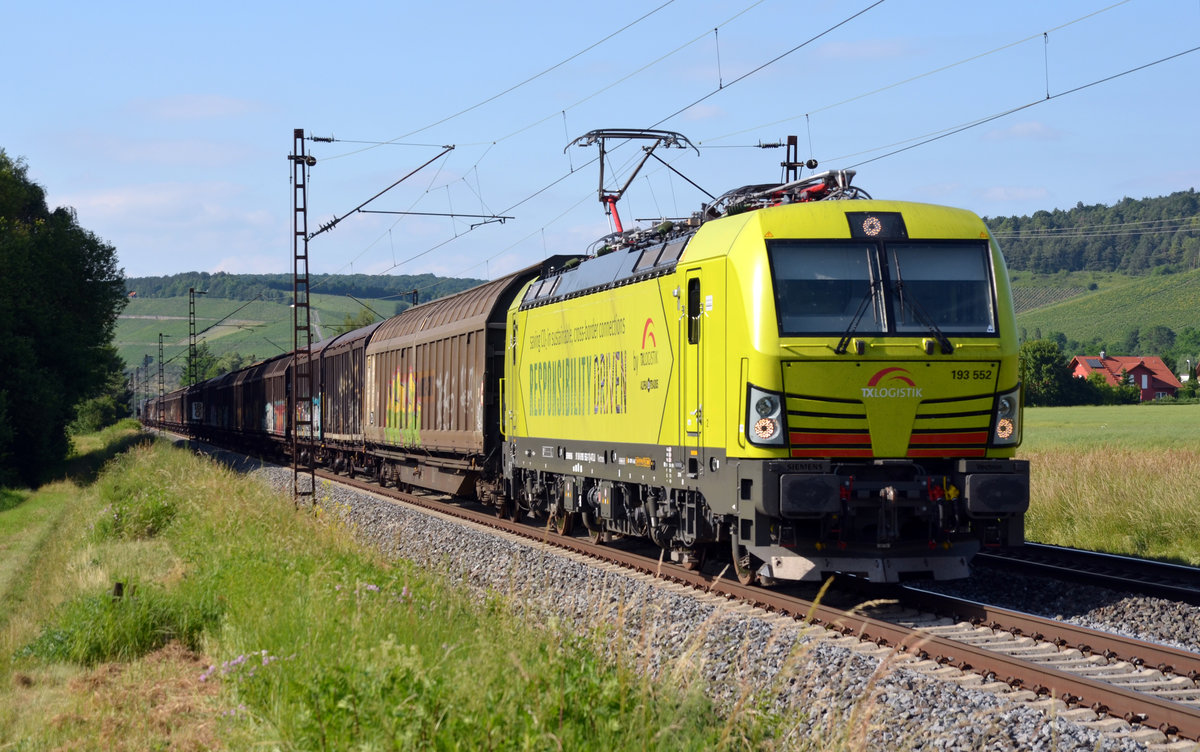 Der Responsibility-Driven-Vectron 193 552 der TX Logistik schleppte am frühen Abend des 13.06.17 einen Schiebewandwagenzug durch Retzbach-Zellingen Richtung Würzburg.