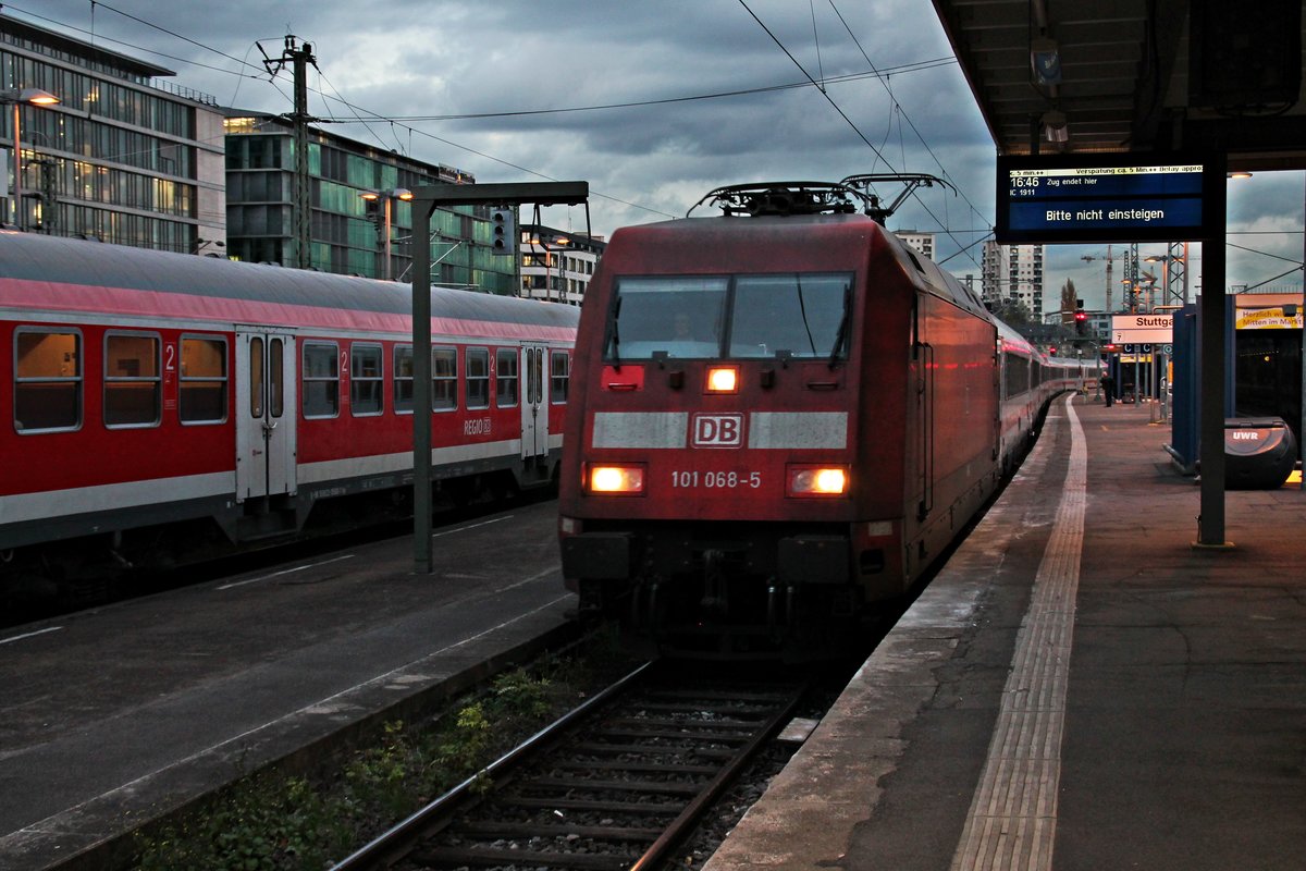 Einfahrt am 06.11.2015 von 101 068-5 mit dem IC 1911 (Dortmund Hbf - Stuttgart Hbf) in den Endbahnhof der Landeshauptstadt von Baden-Württemberg.