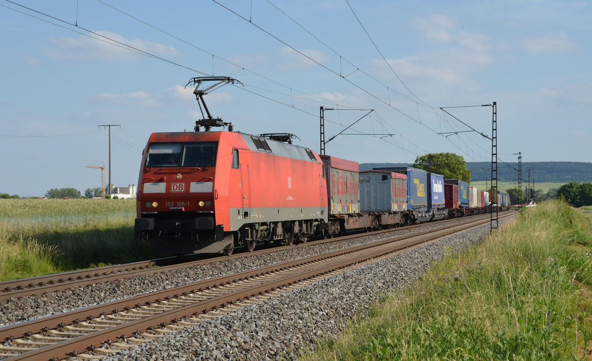 Mit einem Lichtgruß und einem Zug des kombinierten Verkehrs rollte 152 106 am frühen Abend des 13.06.17 durch Retzbach-Zellingen Richtung Gemünden. Gruß zurück!