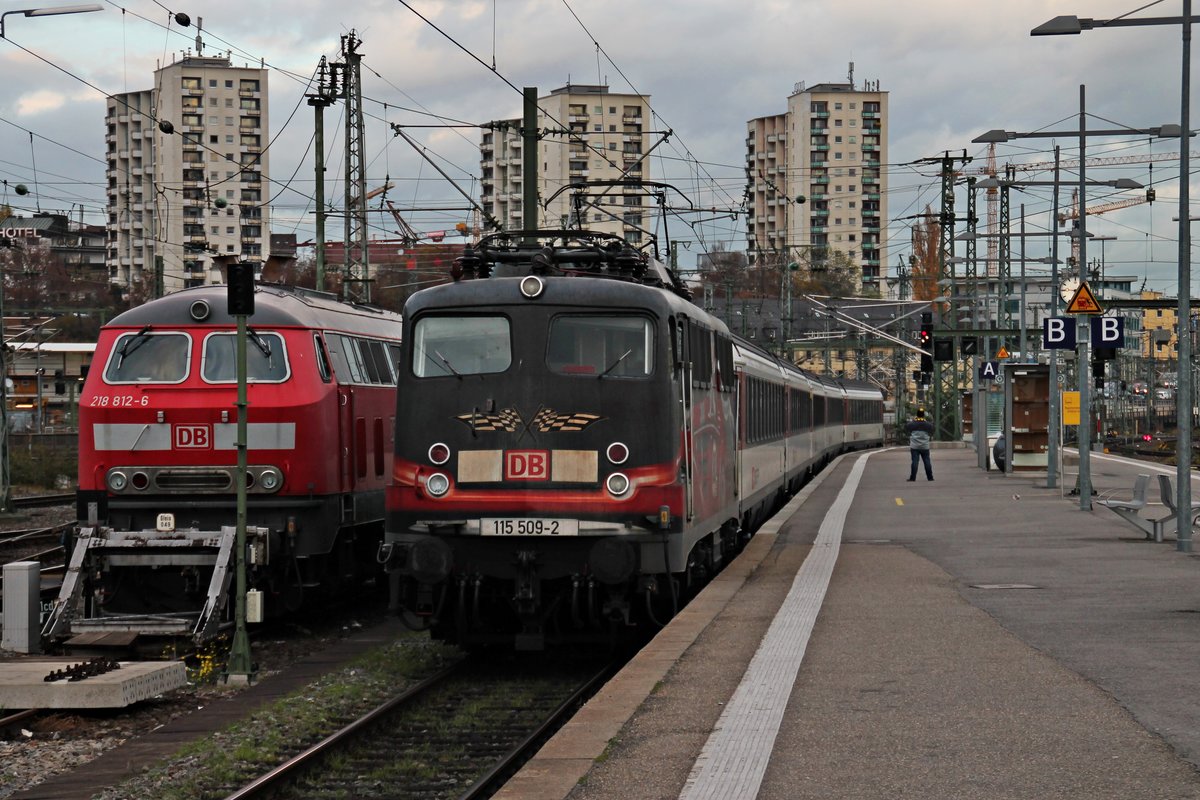Nachschuss am 06.11.2015 auf 115 509-2 "80 Jahre Auto im Zug", welche an 218 812-6 (ex. 218 188-1) vorbei, ihren Gäubahn-IC ins BW Rosenstein aus dem Hauptbahnhof von Stuttgart schob.