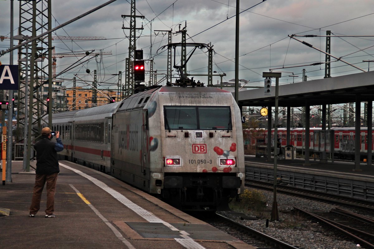 Nachschuss auf 101 050-3 "50 Jahre jugend forscht", welche am 06.11.2015 ihren InterCity aus dem Stuttgarter Hauptbahnhof schob.