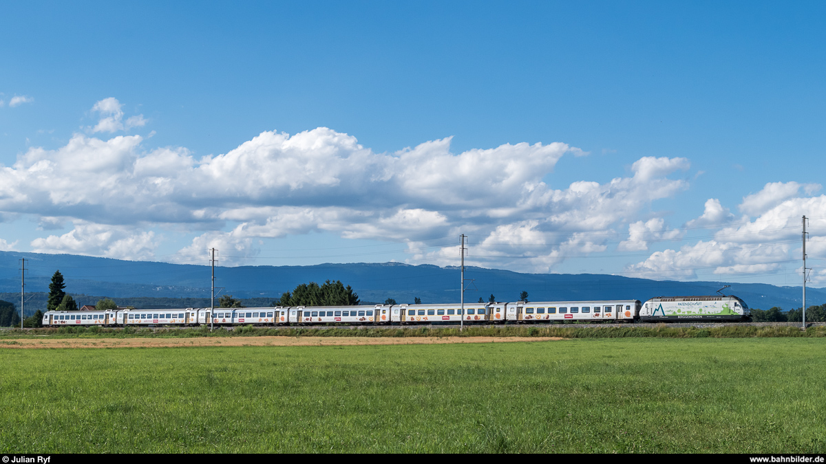 Re 465 008 "Patenschaft Berggemeinden" am 3. Juli 2017 mit dem Kambly-Zug als RE La Chaux-de-Fonds - Bern zwischen Müntschemier und Kerzers.