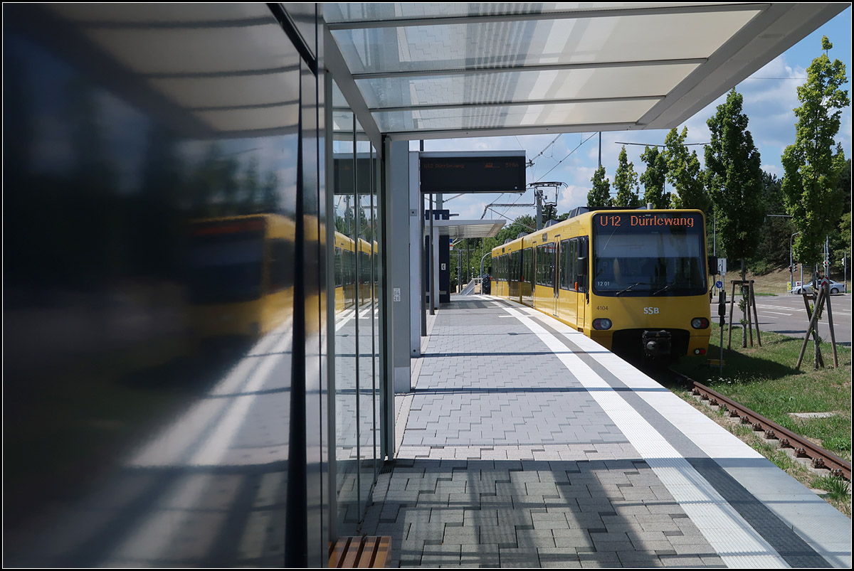 Die gelben Züge werden sich darin dann deutliche spiegeln, als das Wartehäuschen. Fast fertige Haltestelle Bottroper Straßen in Stuttgart-Hallschlag.