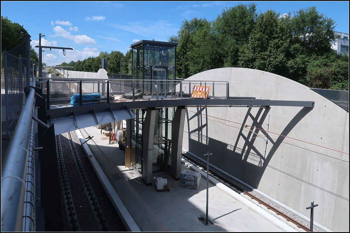 Ende des Jahres wird die Stadtbahnhaltestelle Bottroper Straße in Stuttgart-Hallschlag fertig. Sie liegt am U12-Abschnitt Hallschlag - Neckartal. Die Haltestelle liegt in Tieflage vor dem dortigen Tunnelportal. Runde Formen prägen die Architektur.
