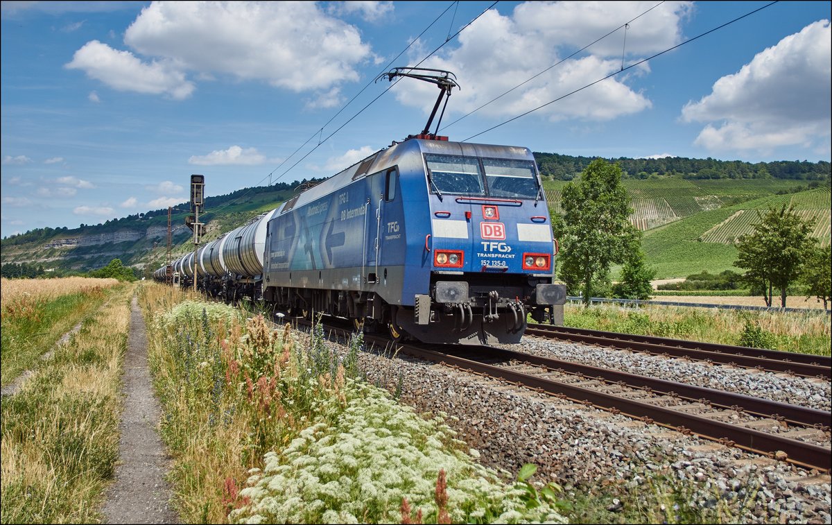 152 135-0 von der TFG ist mit einen Kesselzug bei Thüngersheim am 05.07.2017 zu sehen.