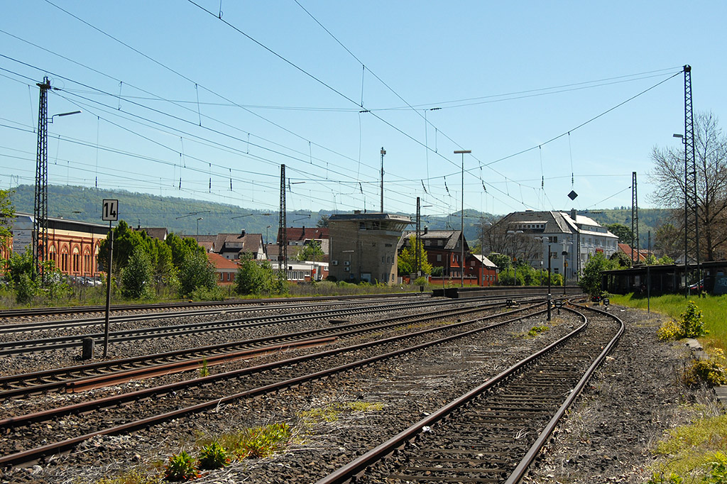 17.05.2017 Stellwerk Süßen mit Gleisvorfeld, vom P+R Parkplatz am westlichen Ende aus aufgenommen