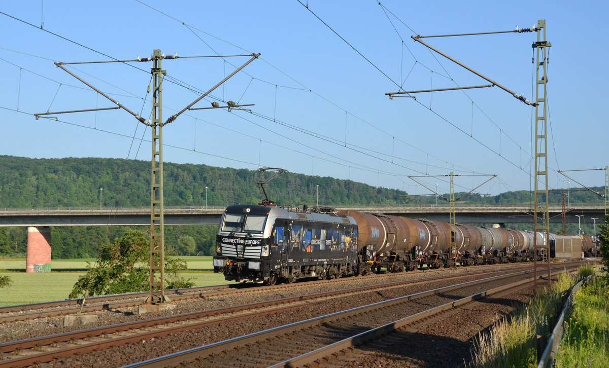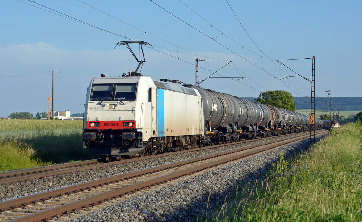 185 636, welche für die HSL im Einsatz ist, führte am Abend des 13.06.17 einen Kesselwagenzug durch Retzbach-Zellingen Richtung Gemünden.