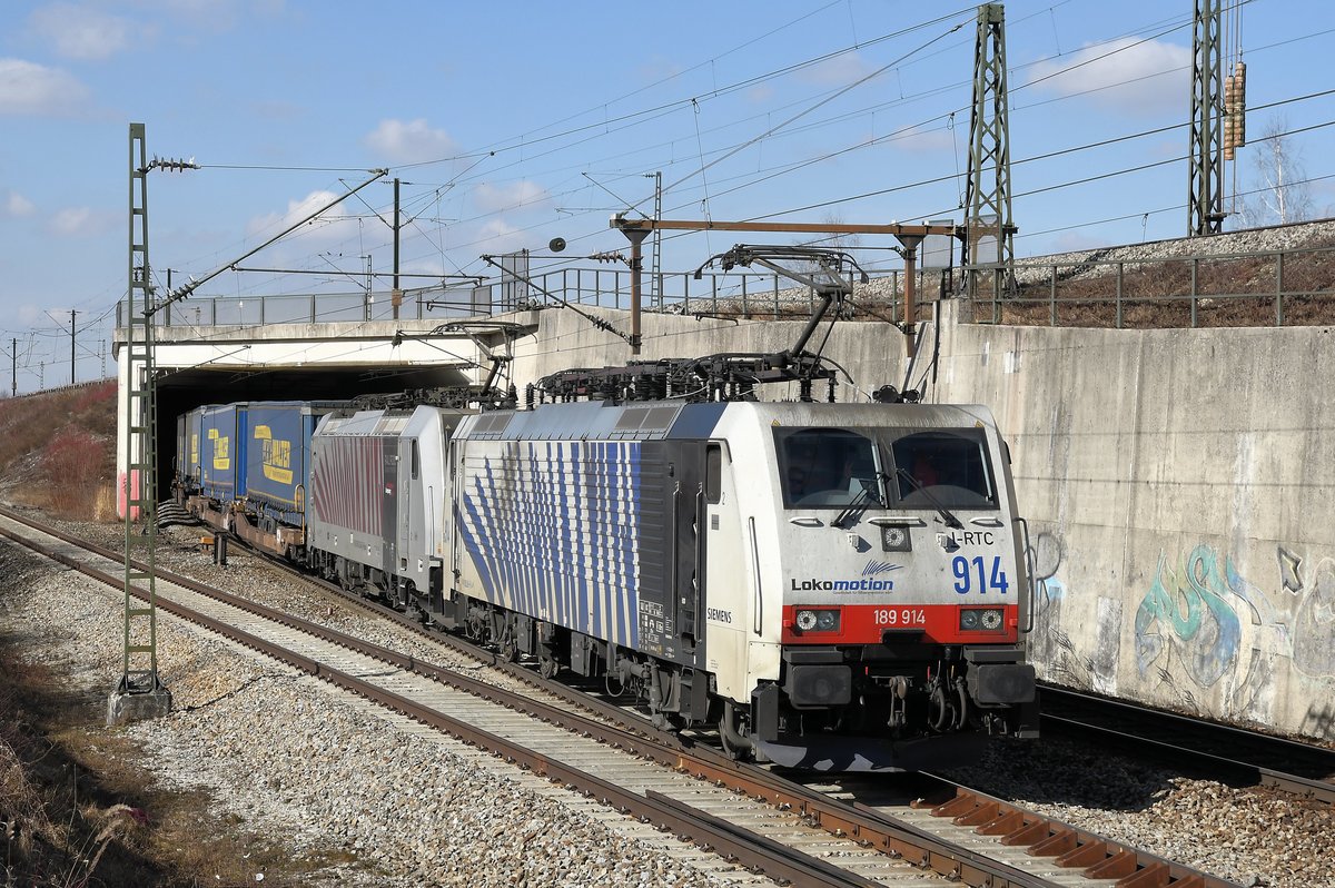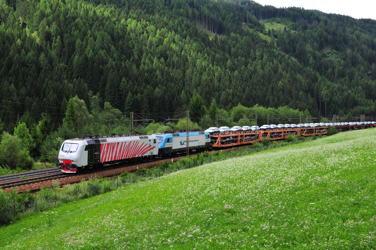 Die EU43-005 von RTC und eine Schwestermaschine vor einem Autozug mit Audi Neuwagen vom Brenner kommend kurz vor Gossensass am 15.07.17