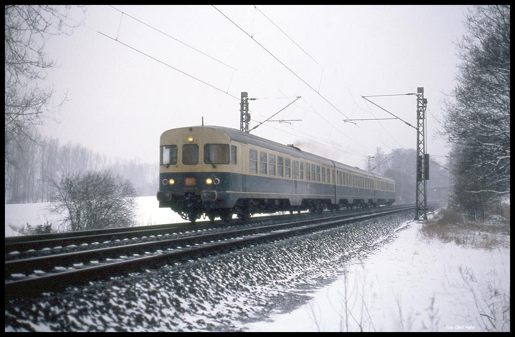 Bei starkem Schneetreiben ist hier der VT 624641 als N 8620 am 13.2.1991 um 15.07 Uhr am Ortsrand von Hasbergen nach Münster unterwegs.