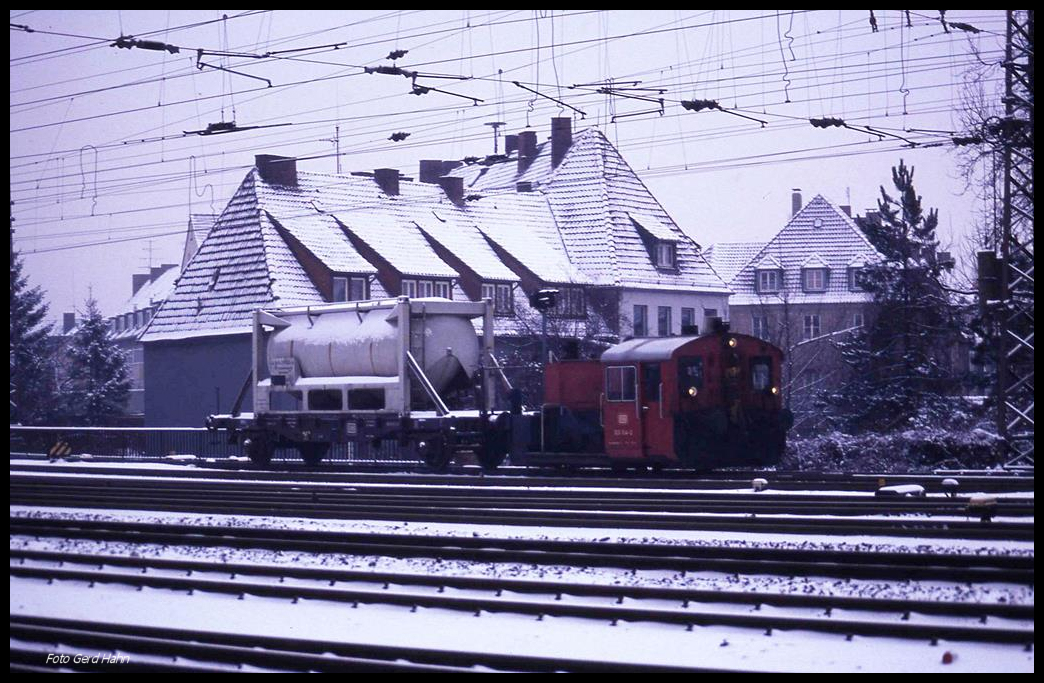 DB 323264 rangiert hier am 13.2.1991 um 10.05 Uhr einen Containerwagen im Hauptbahnhof Osnabrück.