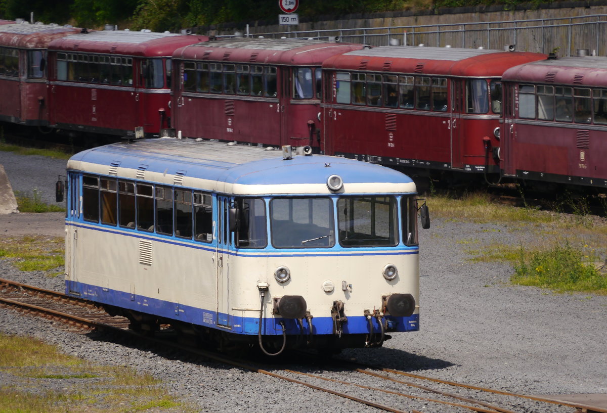 Der steilstreckentaugliche ehemalige VT 57 der Hochwaldbahn, noch in den Farben der Dürener Kreisbahn, am 14.7.17 im Gelände der Eifelbahn in Linz (Rhein). Im Hintergrund weitere, nur zum Teil betriebsbereite Uerdinger Schienenbusse der Eifelbahn in Originallackierung.