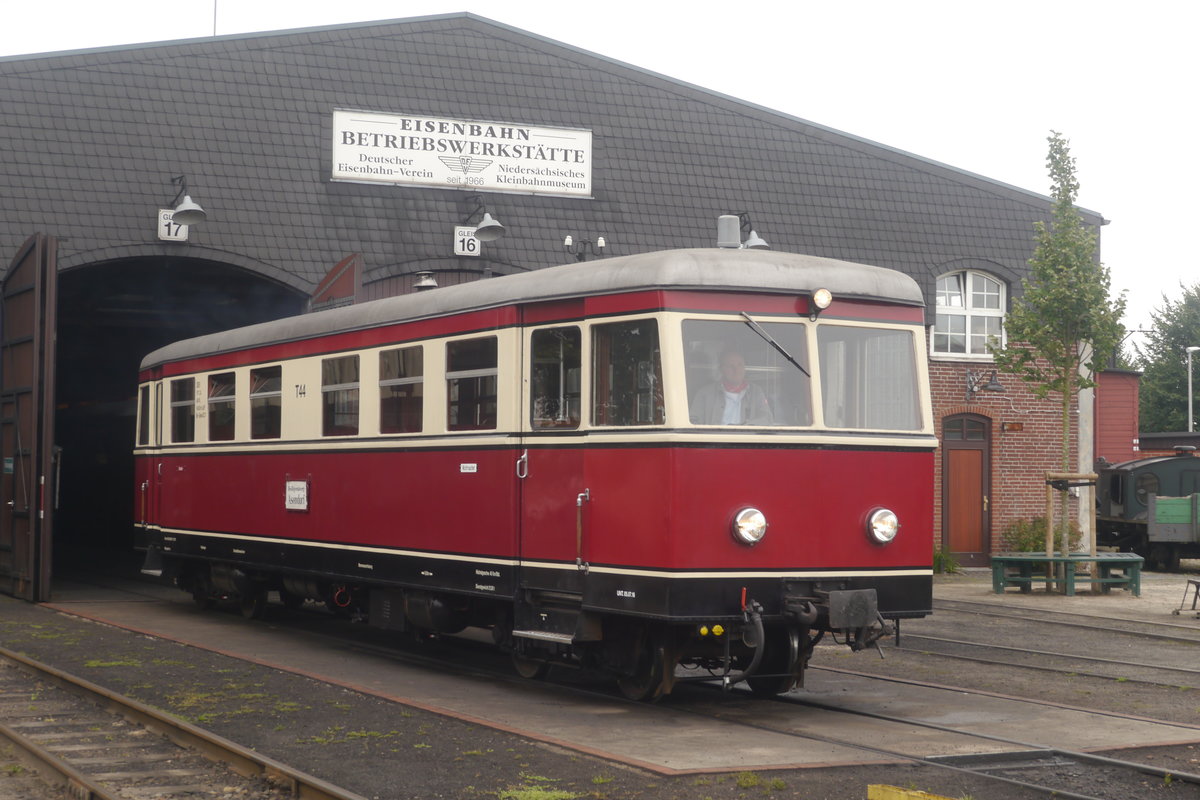 DEV-T 44, ein ehemaliger Juister, wartet vor der Halle in Bruchhausen-Vilsen auf seinen Einsatz. Er wird mit zwei Fahrten nach Asendorf und zurück das Inselbahnwochenende beschließen (16.7.17).