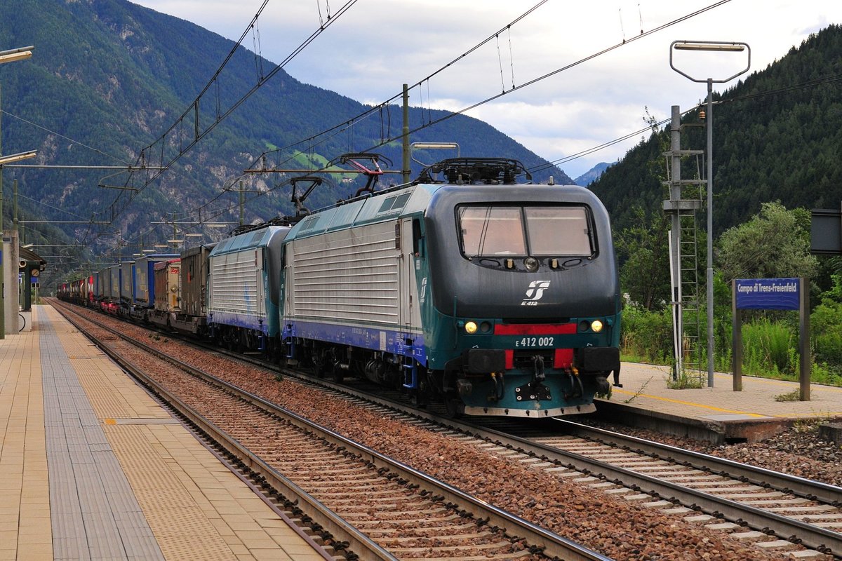 Die E 412 002 der Italienischen Staatsbahn und eine Schwestermaschine vor einem Güterzug am 14.07.17 in Richtung Brenner bei der Durchfahrt am Bahnhof Freienfeld.