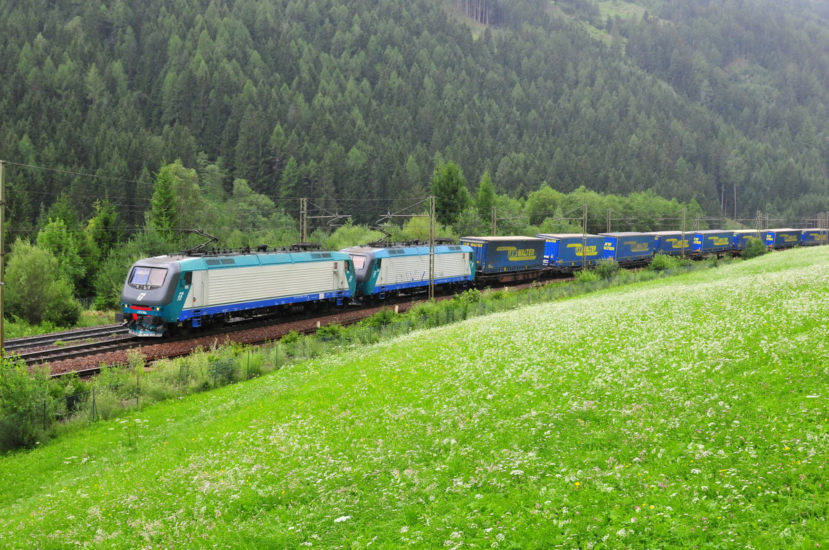 Die E 412 006 der Italienischen Staatsbahn und eine Schwestermaschine vor dem LKW-Walter-Zug vom Brenner kommend kurz vor Gossensass am 15.07.17