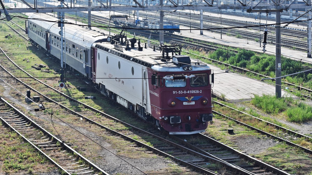 E-Lok 91-53-0-41-0928-2 fährt am frühen Morgen des 08.07.2017 mit kurzer IR-Garnitur aus Bahnhof Timisoara ab.