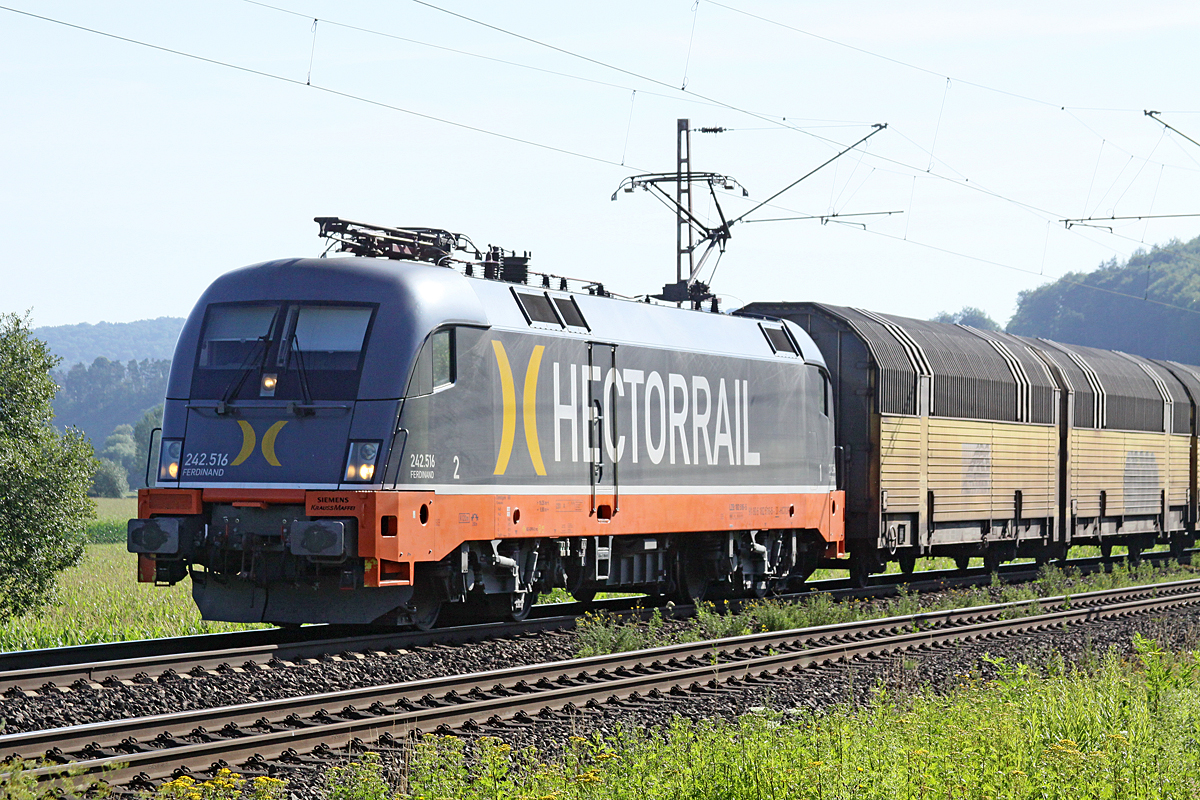 Hectorrail 242 516 " Ferdinand " am 18.07.2017 8:59 nördlich von Salzderhelden am BÜ 75,1 mit einem Altmannzug in Richtung Göttingen