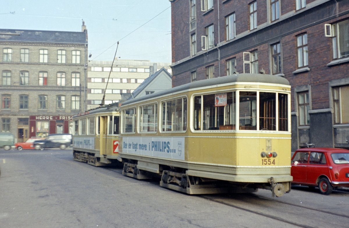 København / Kopenhagen Københavns Sporveje SL 2 (E-Zug): Eines Morgens im September 1968 warten der Tw 513 und der Bw 1554 auf die Rückfahrt in Richtung Sundbyvester Plads auf der Insel Amager. Aufnahmeort: Frederiksberg, Holger Danskes Vej. - Vom Stadtzentrum kommende E-Züge und verspätete Planzüge der SL 2 konnten über die Straßen Ærøvej, Holger Danskes Vej und Nordre Fasanvej wenden, damit sie schneller wieder in Richtung Stadtzentrum, Christianshavn und Amager fahren konnten. Die nächste Wendemöglichkeit war erst die Wendeschleife in Brønshøj (am Brønshøj Torv, wo die SL 2 ihre Endstation hatte).