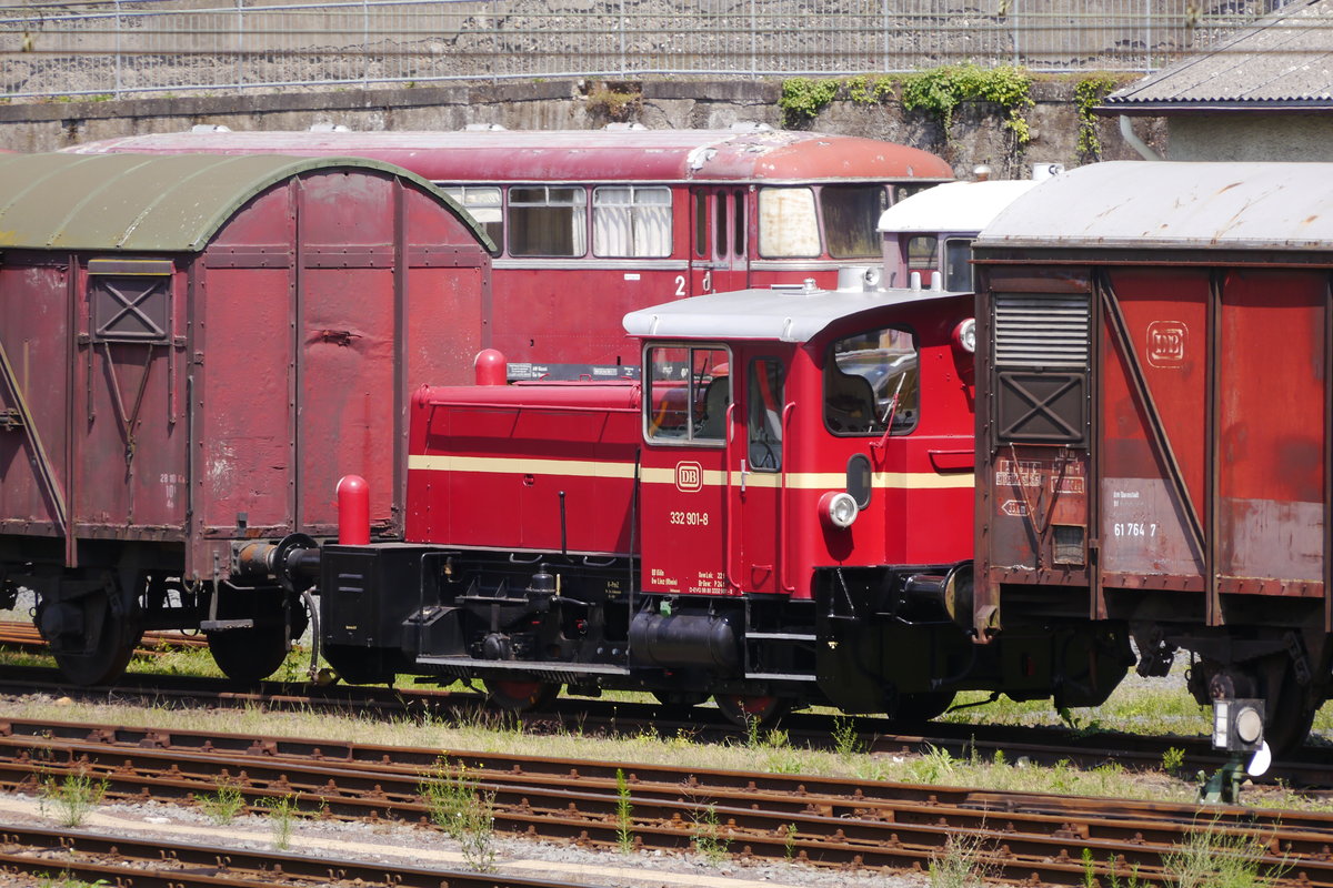 Köf 332 901-8 der DB steht abgestellt im Gelände der Eifelbahn in Linz (Rhein), 14.7.17.