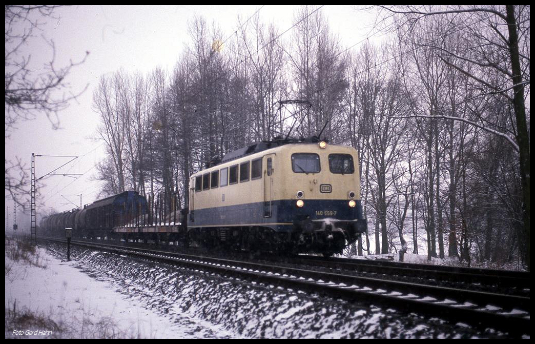 Links fahrend kommt hier am 13.2.1991 um 14.58 Uhr die 140568 mit ihrem Güterzug aus Richtung Münster an der Landesgrenze zu Niedersachsen in Hasbergen an.