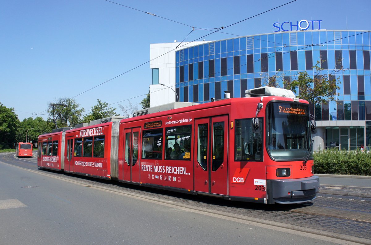 Straßenbahn Mainz: Adtranz GT6M-ZR der MVG Mainz - Wagen 203, aufgenommen im Juni 2017 in der Nähe der Haltestelle "Bismarckplatz" in Mainz.