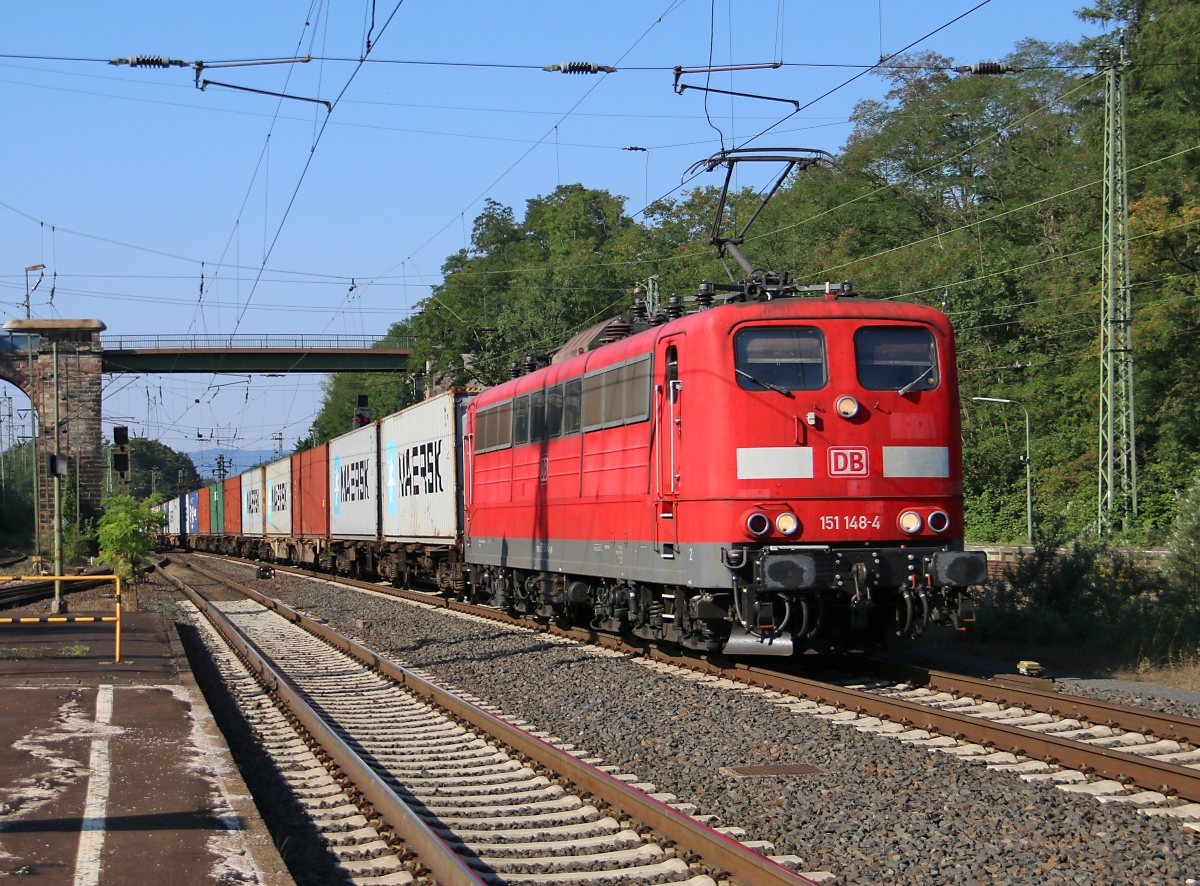 151 148-4 mit Containerzug in Fahrtrichtung Norden. Aufgenommen am 22.08.2015 in Eichenberg.