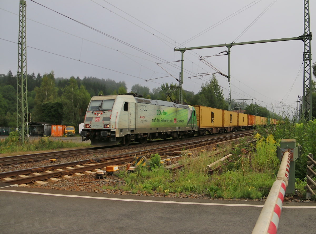 185 389-4 mit Containerzug in Fahrtrichtung Süden. Aufgenommen am BÜ zwischen Eltmannshausen und Oberhone am 19.08.2015.