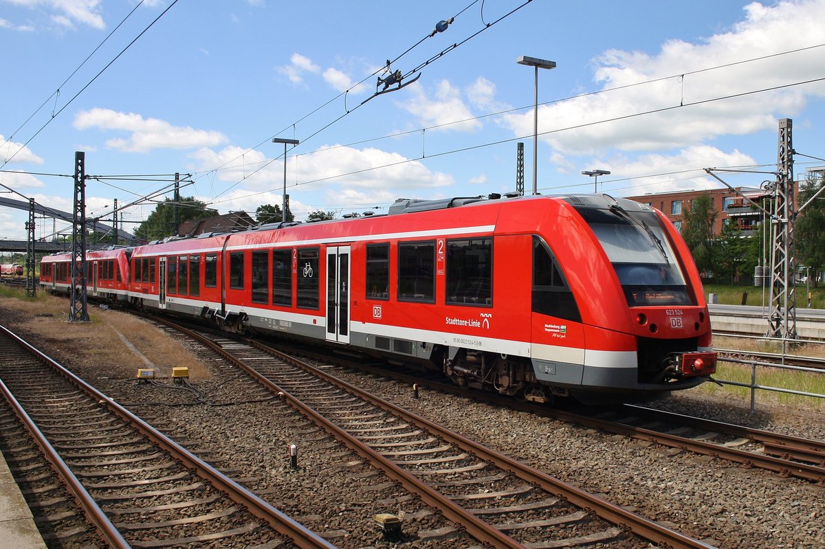 623 530-2 und 623 024-6 machen sich am 17.6.2017 als RE4 (RE13089) von Lübeck Hauptbahnhof nach Bad Kleinen im Startbahnhof auf den Weg.