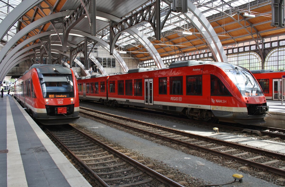 648 338-1 "Lauenburg/Elbe" und 648 961-0 treffen am 17.6.2017 als RE83 (RE21819) von Kiel Hauptbahnhof nach Lüneburg im Lübecker Hauptbahnhof auf 648 347-2 "Ratekau" als RB85 (RB21796) nach Puttgarden.