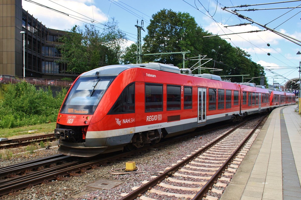 648 355-5 "Fehmarn" und 648 352-2 verlassen am 17.6.2017 als RB75 (RB21268) von Kiel Hauptbahnhof nach Rendsburg den Startbahnhof.