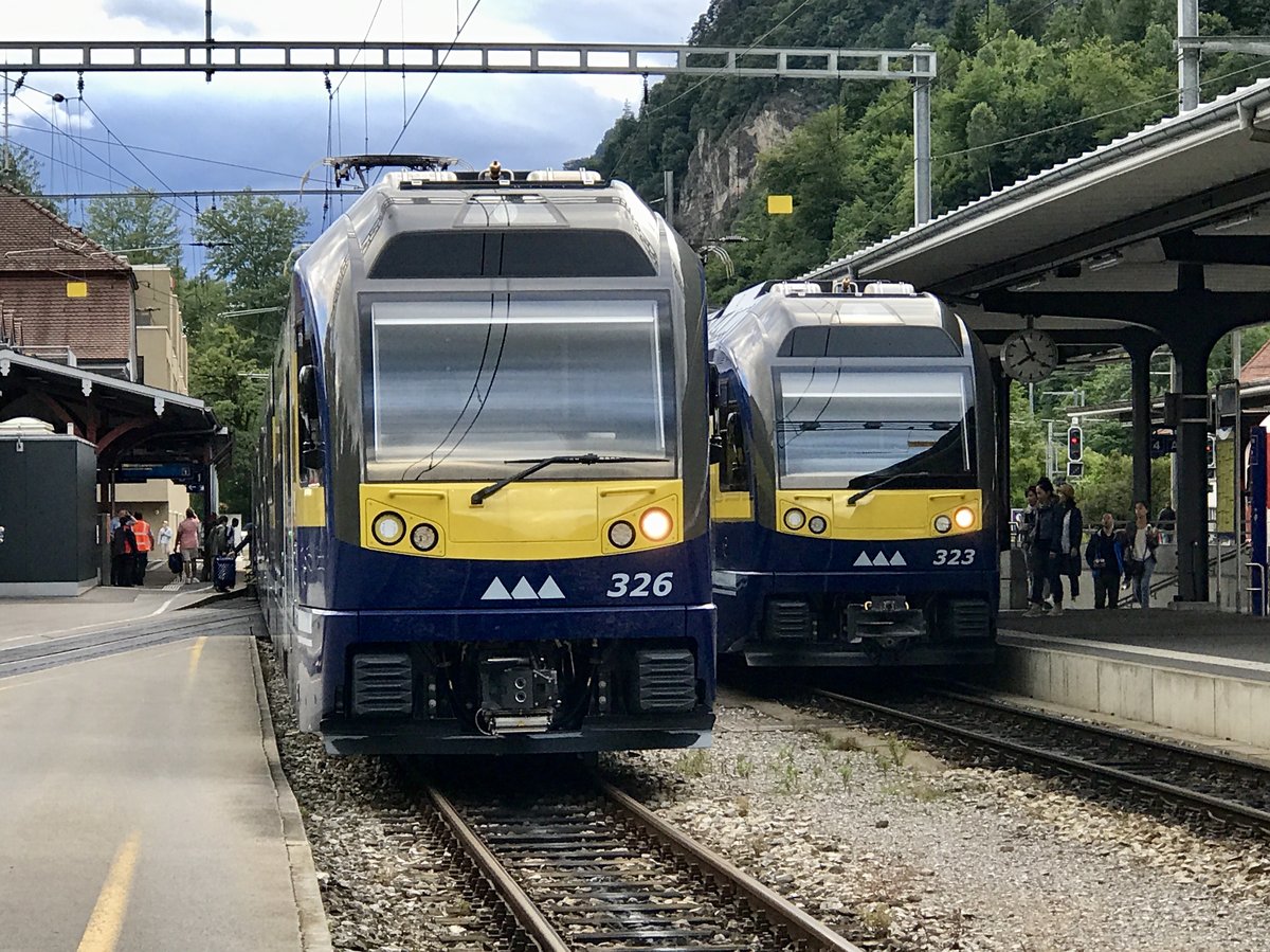 ABDeh 8/8 326 und 323 am 1.7.17 zusammen im Bhf Interlaken.
