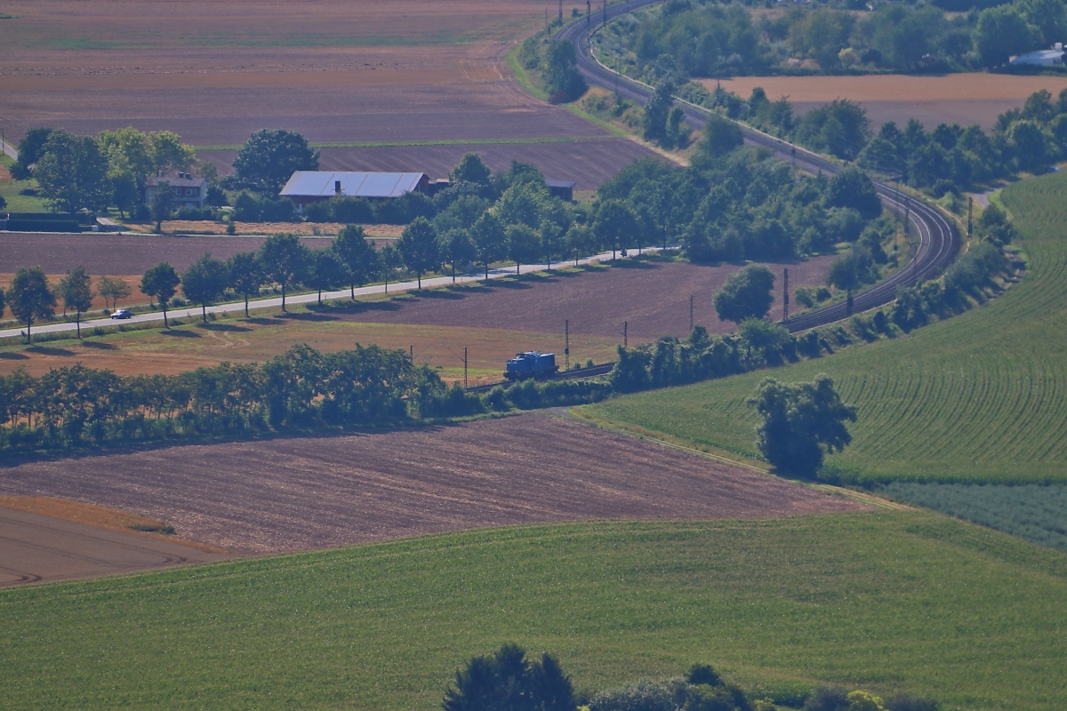 Ein Blick hinab vom Schloss Rothestein bei Bad Sooden-Allendorf zeigt eine einsame PRESS V100, die sich ihren Weg über die KBS 613 gen Süden bahnt. Aufgenommen am 02.08.2015.