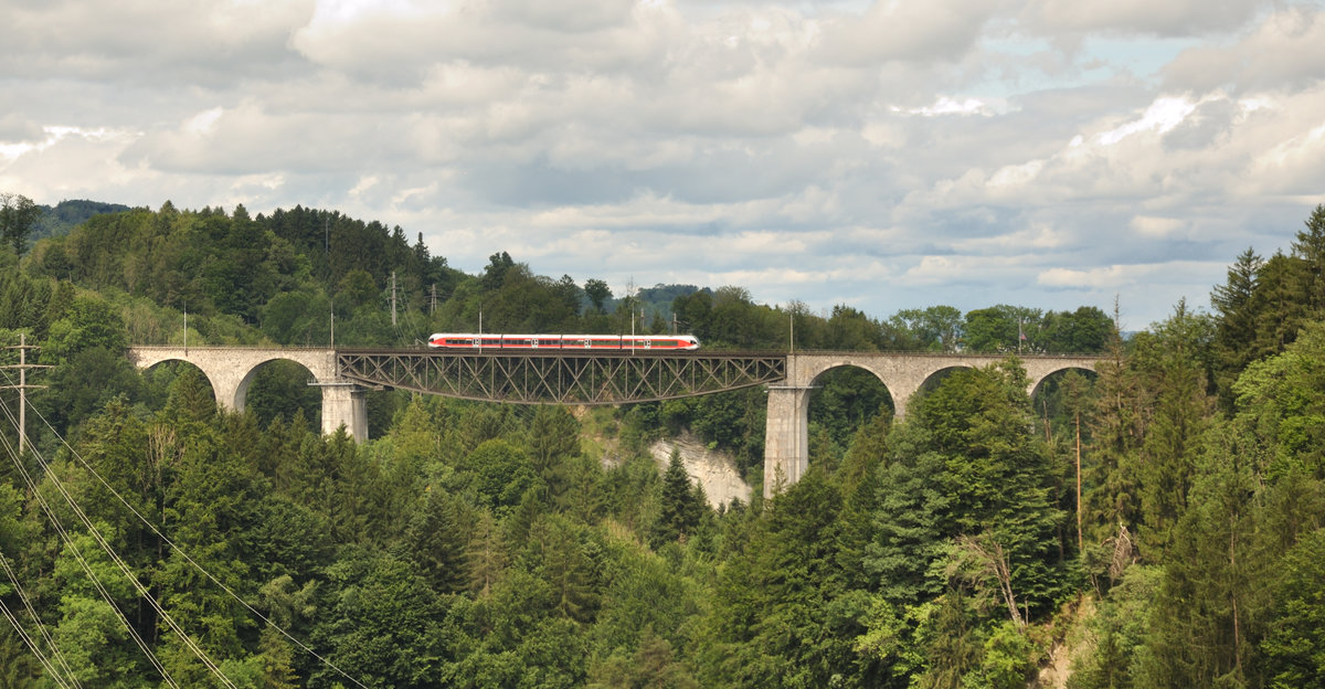 Ein RABe 526 (Stadler GTW) fährt über den Sitterviadukt zwischen St. Gallen und Herisau.