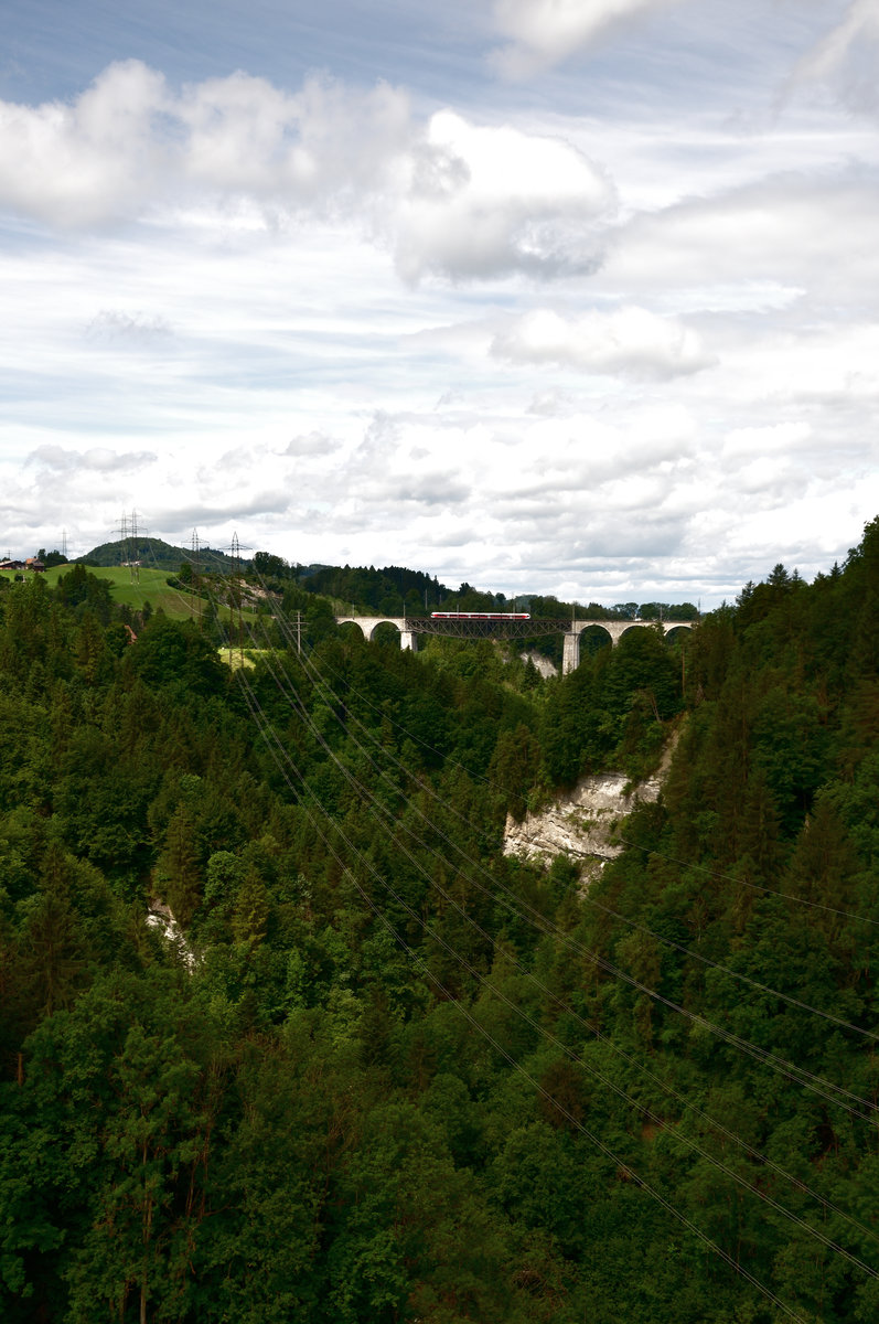 Ein Voralpenexpress, bestehend aus zwei RBDe 561, Revivo- und EW I Wagen, fährt über den 99m hohen Sitterviadukt zwischen St. Gallen und Herisau.