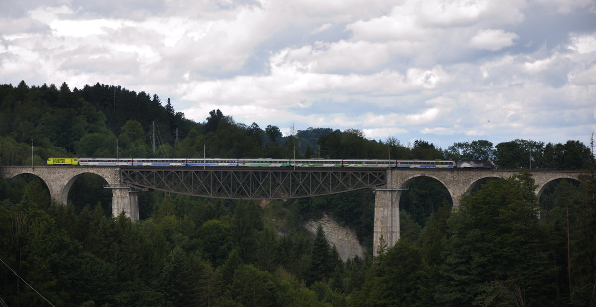 Ein Voralpen Express, bestehend aus zwei Re 446 und Revivo Wagen, überquert den 99m hohen Sitterviadukt zwischen St. Gallen und Herisau.