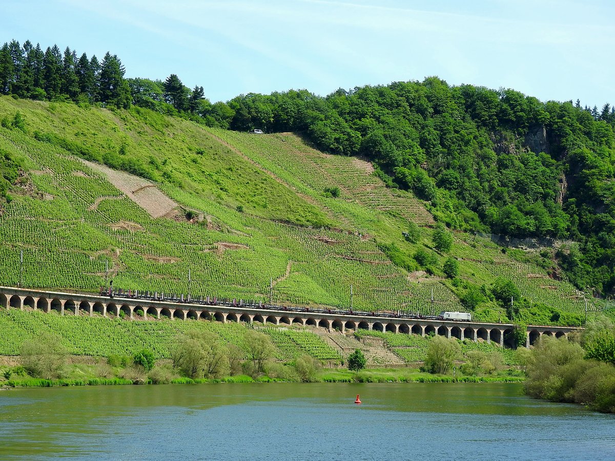 Güterzug mit Stahlplatten entlang der Pündericher Galerie in Richtung Bullay; 170612