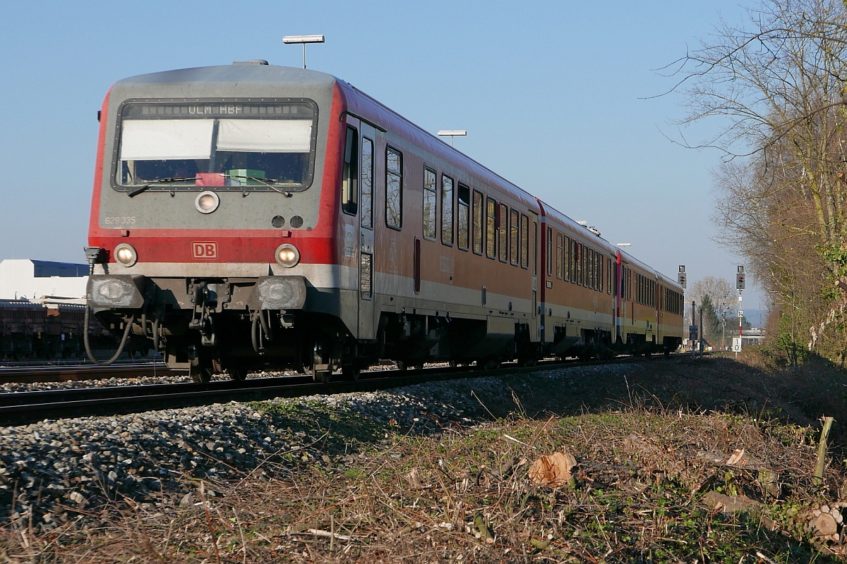 Kurz vor der Einfahrt in den Friedrichshafener Stadtbahnhof befindet sich 629 335 von Lindau kommend als IRE 4234 auf der Fahrt nach Ulm (27.03.2017).